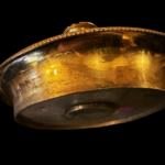 Base ronde en cuvette, tige support des bras de lumière et de l’abat-jour en tôle, en acier patiné.