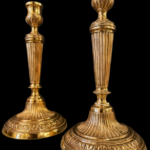 Paire de flambeaux en bronze ciselé doré à fut cannelé, embase cannelée et décorée de feuilles d’eau et de perlé.