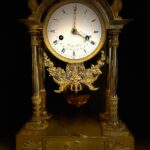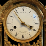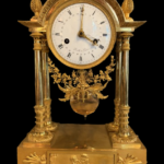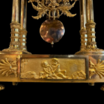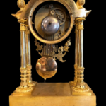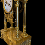 Pendule cage Empire en bronze ciselé doré, à quatre colonnes lisses sur pilastres décorés.