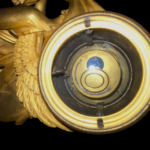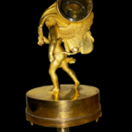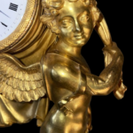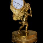 Pendulette en bronze ciselé doré représentant un amour portefaix, sur une embase ovale décorée d’une guirlande fleurie.