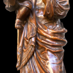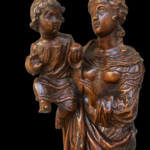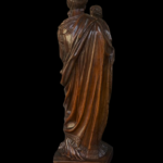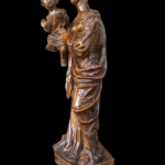 Statue en bois de buis, sculpté à patine cirée, représentant la vierge Marie tenant sur son bras droit l’enfant Jésus.